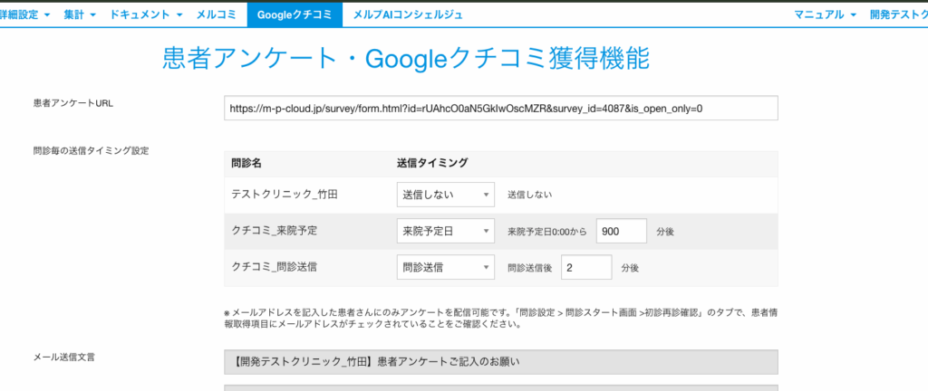 Googleクチコミ設定画面で、問診票毎に送信のタイミングが設定できるようになりました。