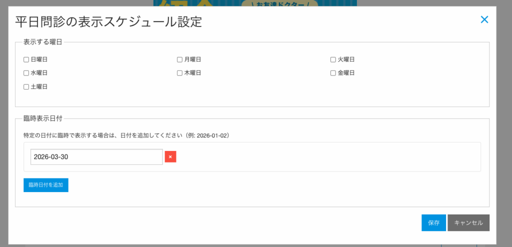 「表示する曜日」のチェックがすべてOFFの状態でも、「臨時表示日付」に設定がある場合、問診共通表示のON・OFFを切り替えてもチェック状態が保持されるよう改修します。