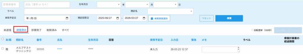 「問診送信」⇒届いた患者問診を貼り付け操作を行い、問診ステースタスが「送信済み」になってから○○分後に送信