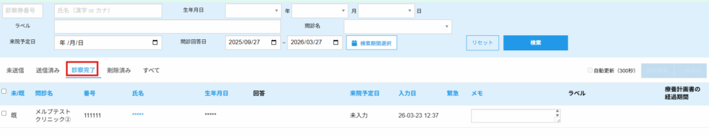 「診察完了」⇒問診ステースタスを「診察完了」へ手動で変更してから○○分後に送信