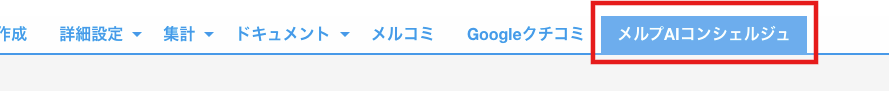 メルプ管理画面上部のタブに「メルプAIコンシェルジュ」のタブメニューが追加され、チャットボット機能がご利用いただけるようになります。