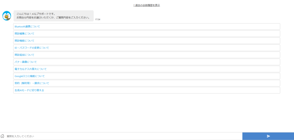 このチャットボット機能は常時ご利用いただけますが、ボットで解決しない場合はメルプご契約先のサポート窓口にお問い合わせください。