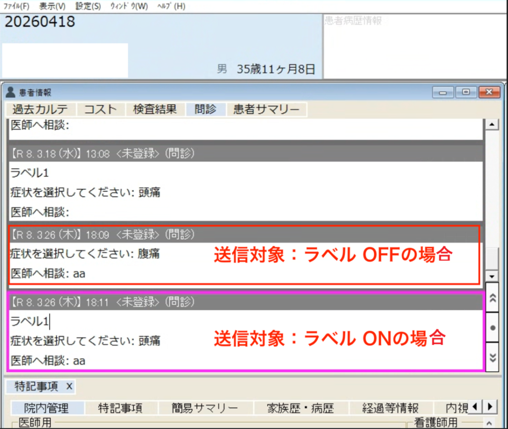 Medicomへの問診内容転記時、「ラベル」を送信する/しないの設定になります。