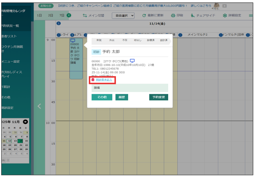 メディカル革命 byGMOの予約管理カレンダーにて、患者様の問診回答状況を確認することができ、予約経由で問診回答がある場合は該当予約の箇所へメルプアイコンが表示されます。
