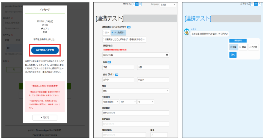 診察券番号や氏名、予約日時、電話番号などの情報が共有されますので、患者さんの入力の手間が省かれます。
