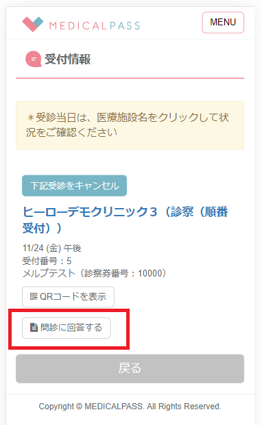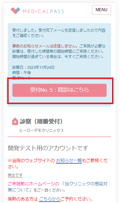MEDICALPASSの予約登録完了画面にメルプWEB問診入力ボタンが表示されます。