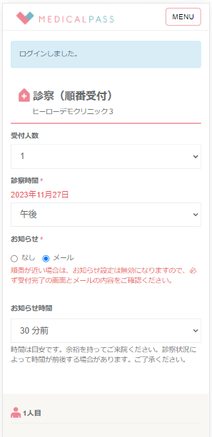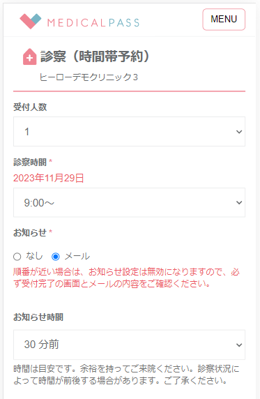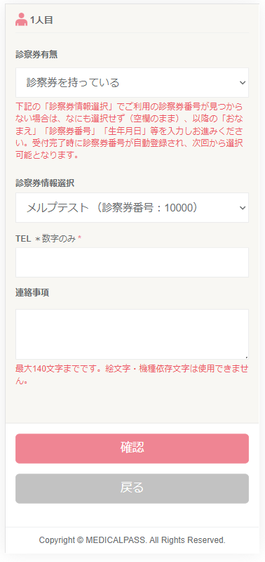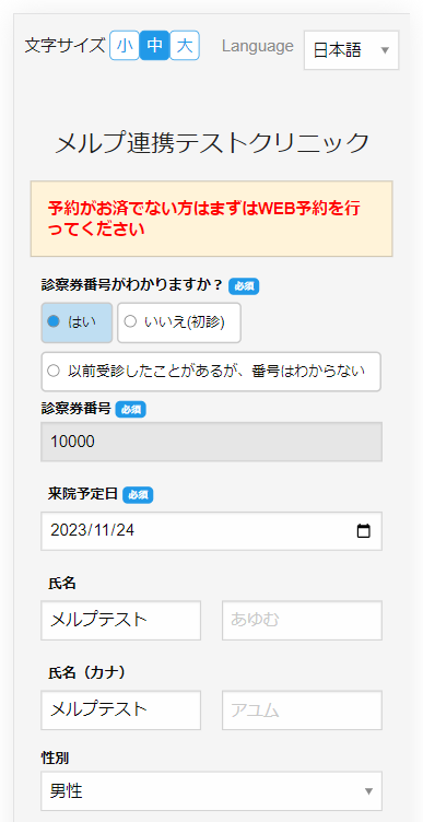 (診察券番号などの入力欄は、メルプ側で「表示・非表示」設定が可能なため)