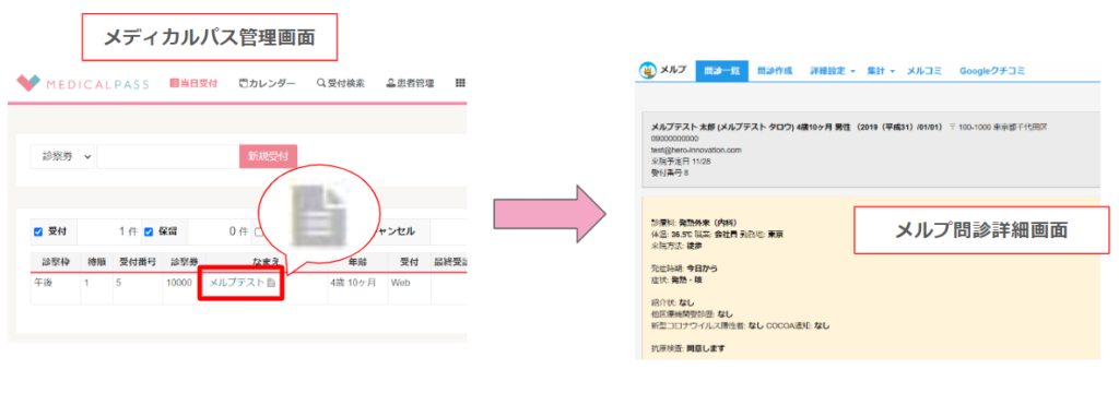 また、アイコンをクリックするとメルプ管理画面に遷移し、問診詳細画面が表示されます。