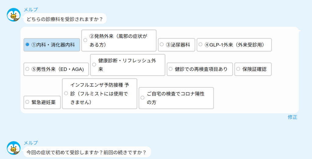 まず、メルプの問診を事前回答されずに来院された患者さんに関しては、受付で軽くお話を伺ったうえでメルプの問診に回答いただき、診察室にご案内します。